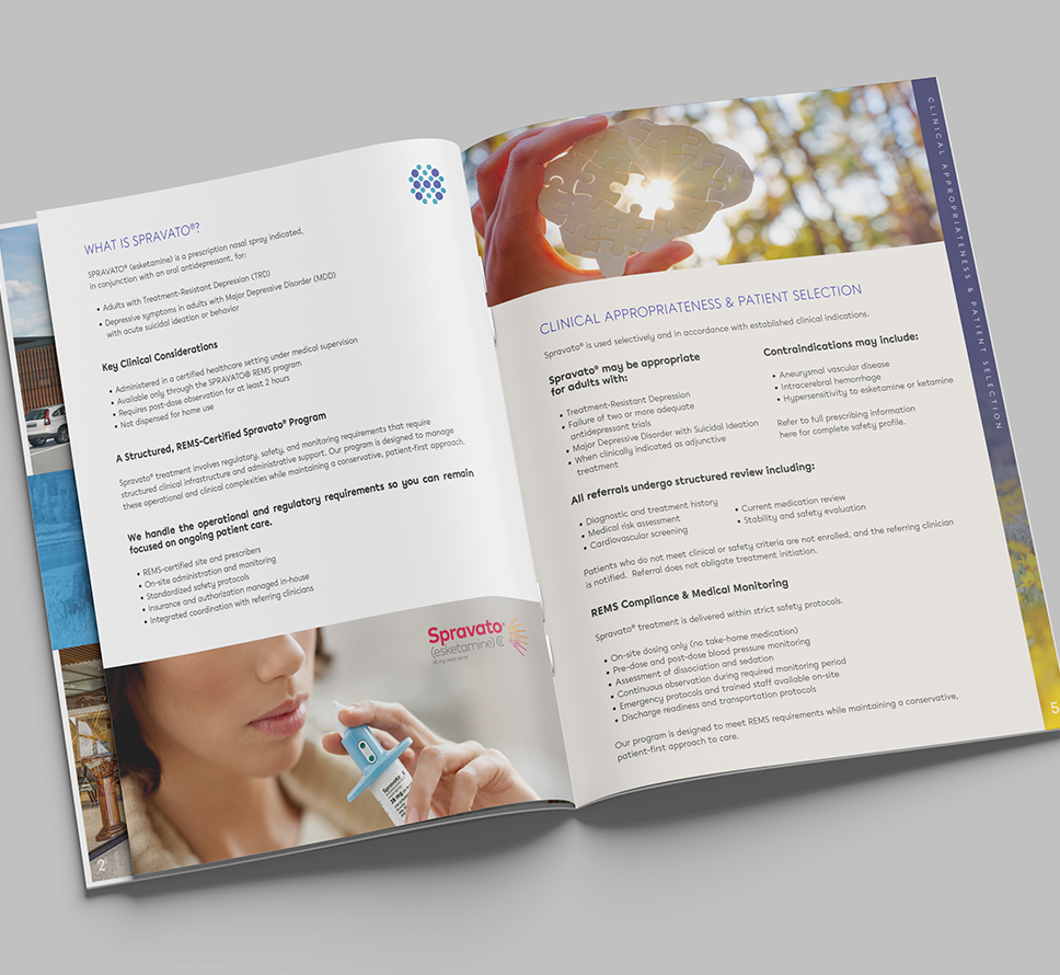 Comprehensive, clinician-reviewed print and digital brochure explaining SPRAVATO®, the treatment process, benefits, care environment, and its role within an integrated mental health program, including coordinated use with Transcranial Magnetic Stimulation (TMS)