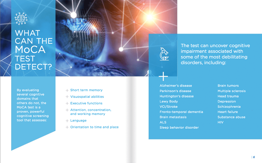 The MoCA test is used globally by healthcare professionals to detect cognitive impairments early on for faster diagnosis and improved patient care. MoCA is the most sensitive test available for detecting Alzheimer’s disease. It measures executive functions and multiple cognitive domains, which are important components not measured by the Mini-Mental State Examination (MMSE).