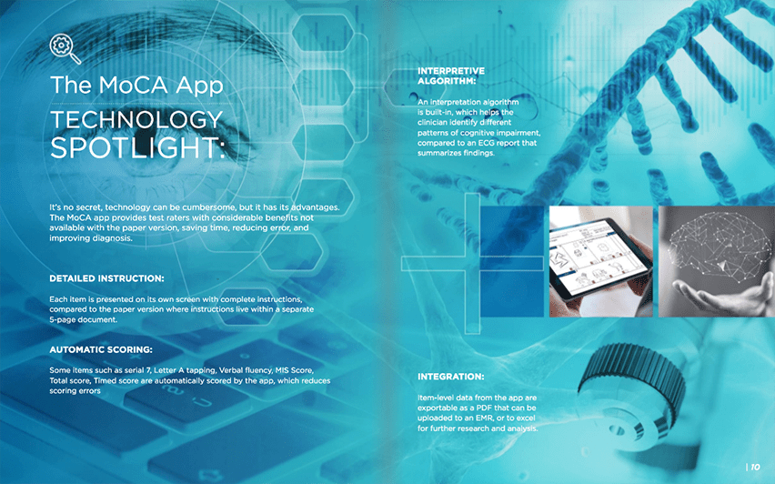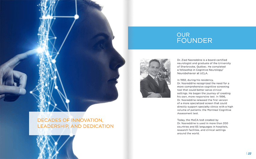 Quaintise paired inbound marketing efforts with traditional outbound efforts to create a well-rounded and tailored approach to their outreach. This included a tri-fold brochure that targeted occupational therapists, nurses, neurologists, psychiatrists, and geriatricians. In addition, an institutional brochure with a digital flipbook was developed to target larger medical and research institutions interested in licensing MoCA